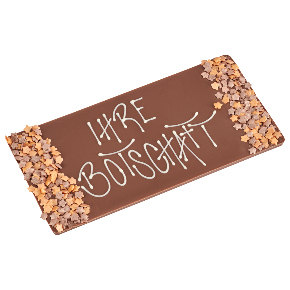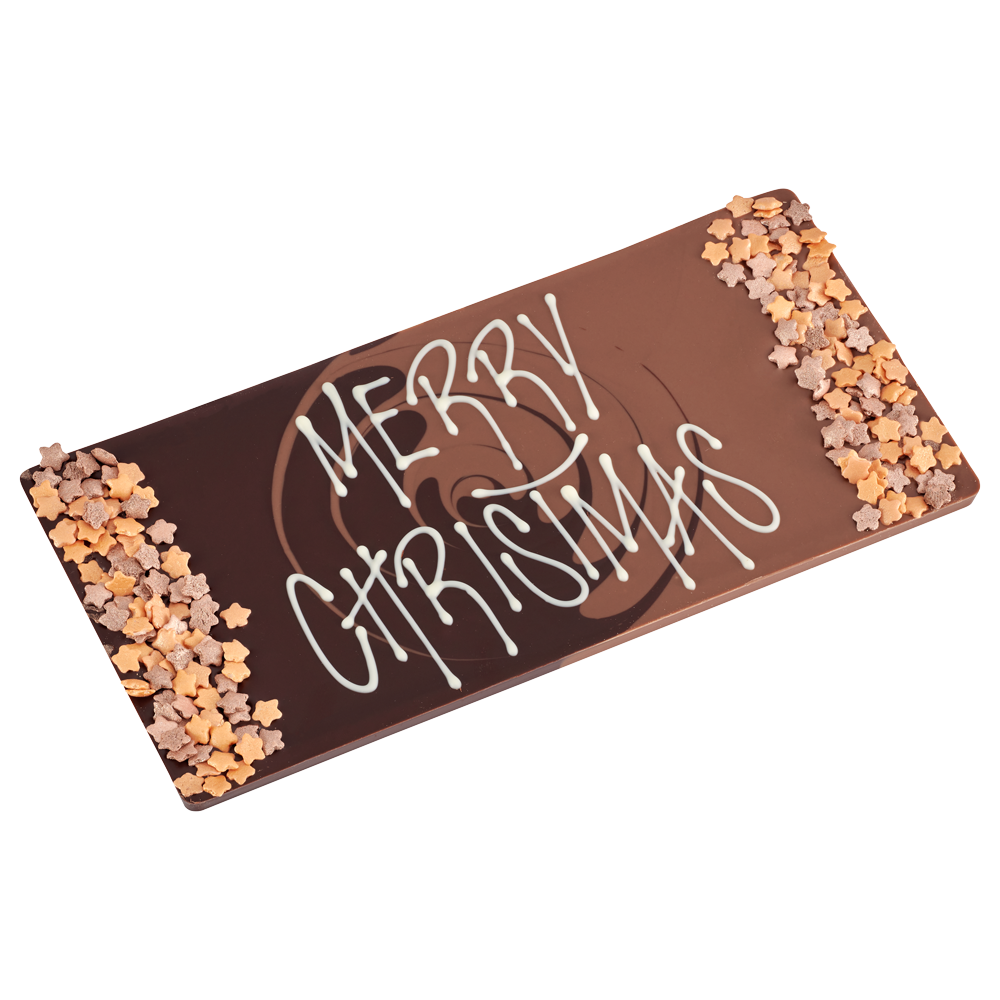Wenn Weihnachten vor der Tür steht, haben unsere Confiseure alle Hände voll zu tun. Unsere Confiserie Schokoladentafel Xmas ist handgefertigt und liebevoll mit Sternen dekoriert. Jede Tafel ist ein Unikat und wird in sorgfältiger Handarbeit mit Ihrer individuellen Weihnachts-Botschaft beschriftet. Eine wundervolle Art Ihren Kunden oder Ihren Mitarbeitenden etwas Schönes zu wünschen. Das süsse Geschenk wird in einem Zellophan-Beutel mit schlichter Masche verpackt. Auf Wunsch platzieren wir gerne einen Sticker mit Ihrem Firmenlogo auf dem Säckchen.