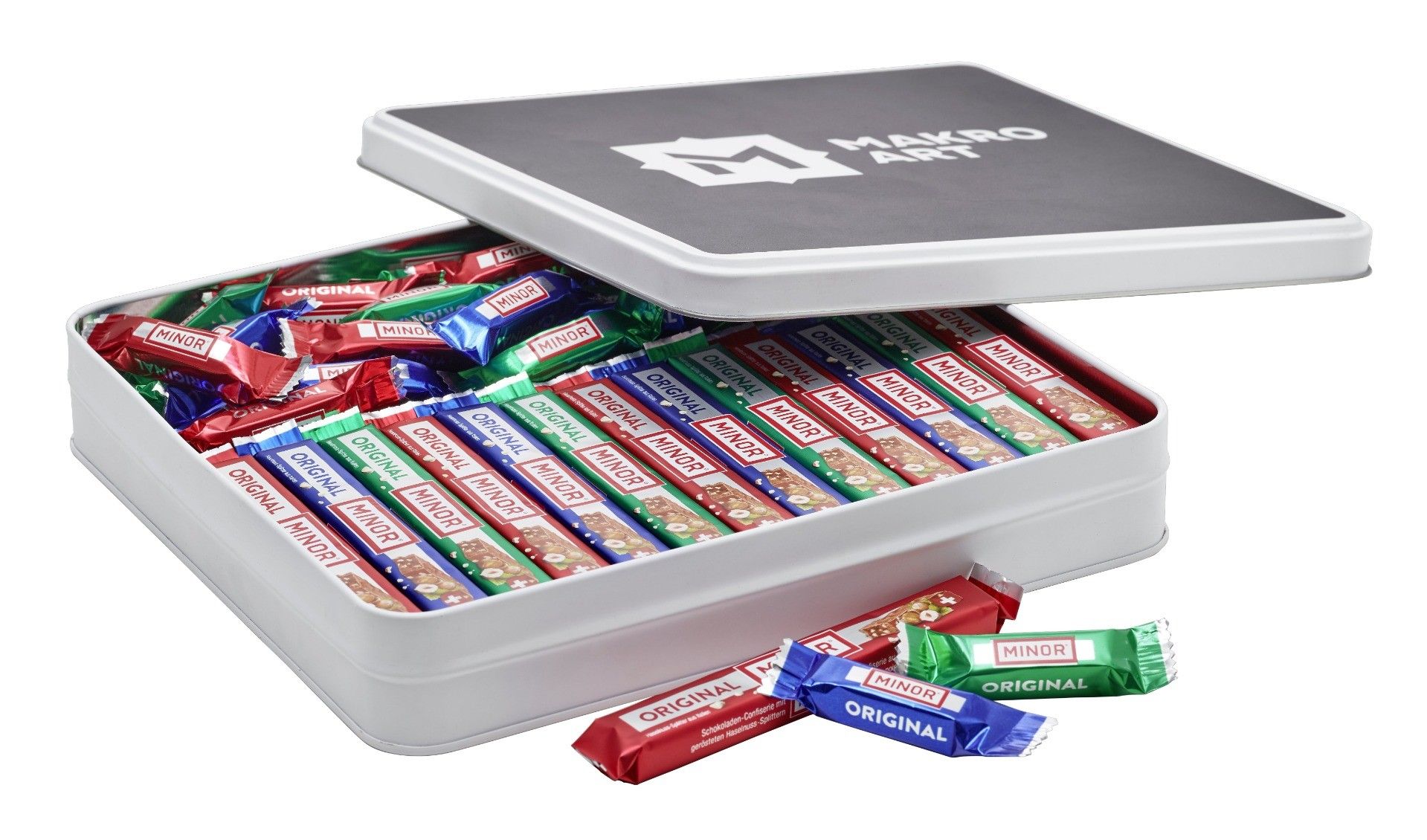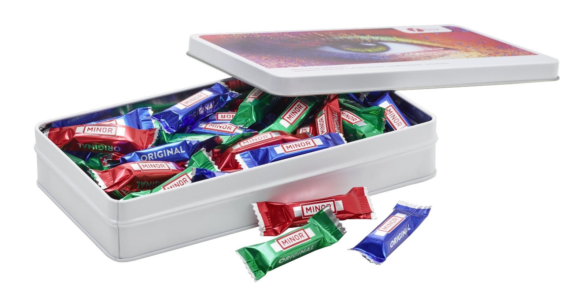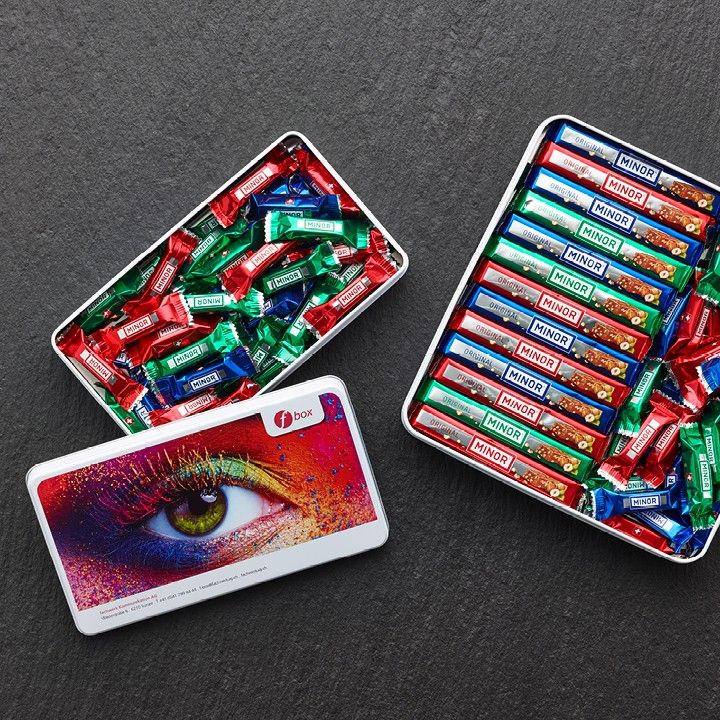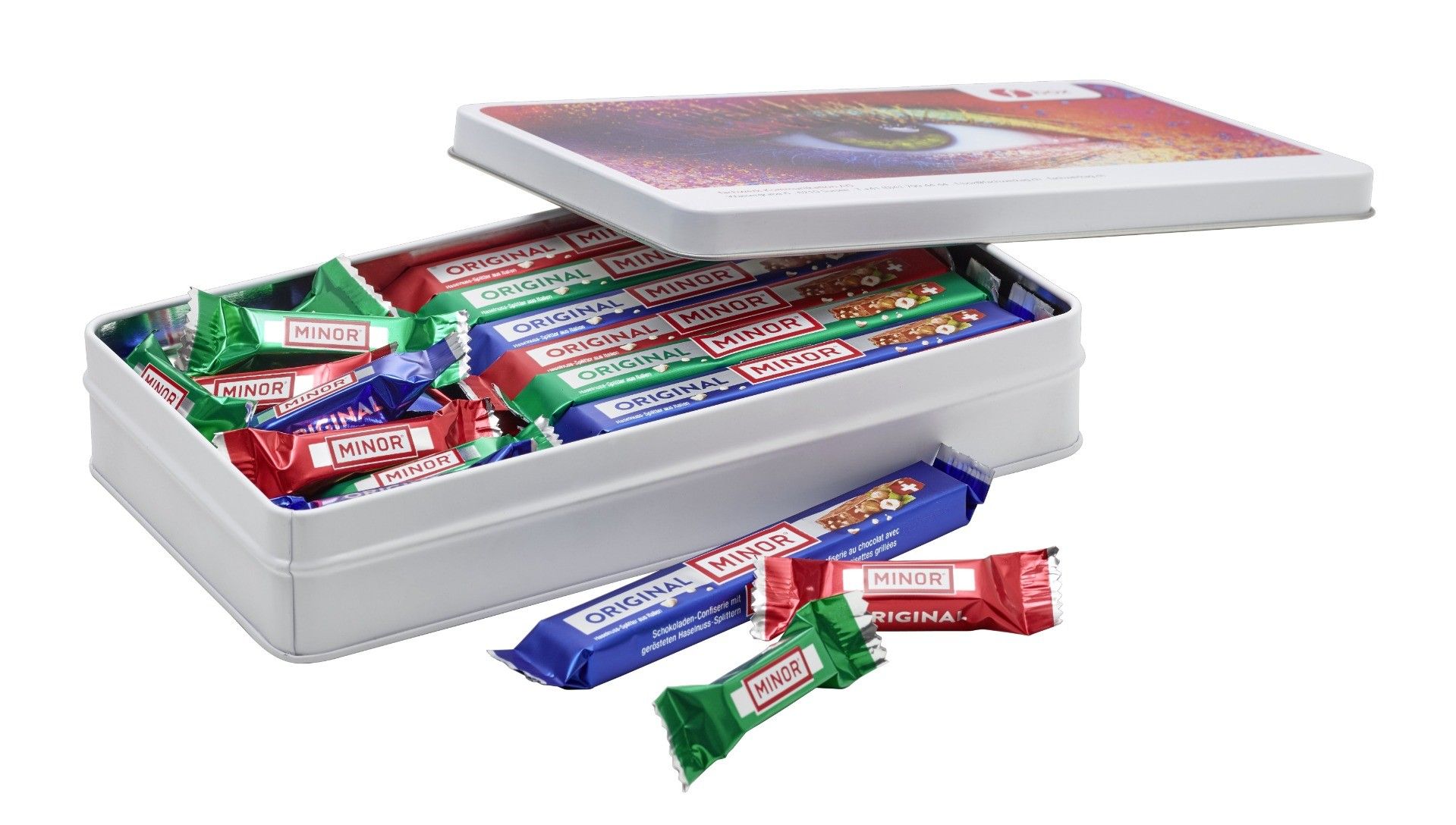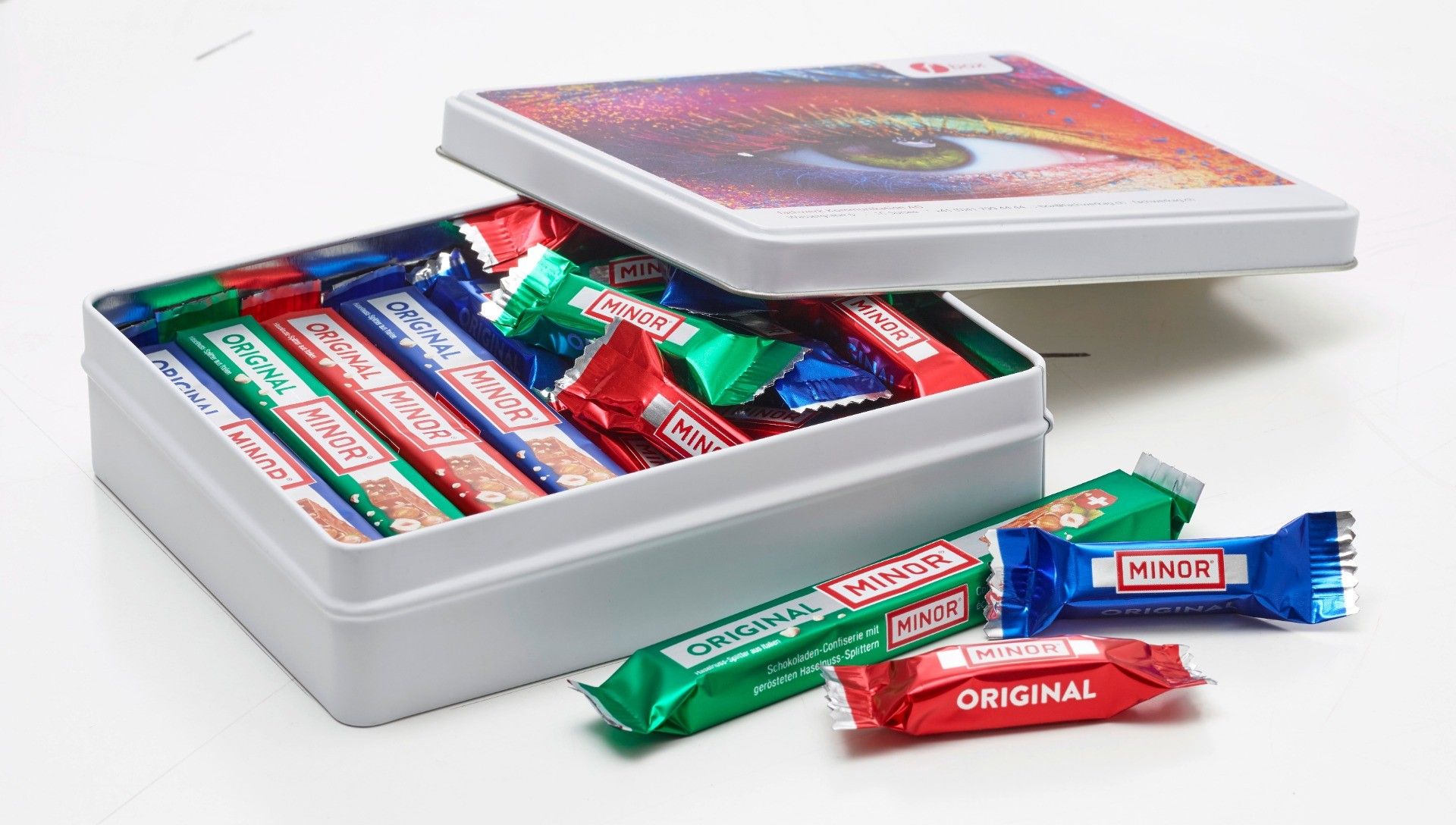 Die hochwertige Dose voller Minor Glücksmomente kann auf dem Deckel im Corporate Design Ihres Unternehmens kunstvoll bedruckt werden. Liefern Sie uns Ihr Wunschlayout oder lassen Sie sich von unseren talentierten Grafikdesignern ein individuelles Design gestalten. Ein Geschenk, das Genuss und Ihr Engagement für Nachhaltigkeit vereint.